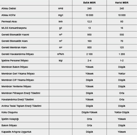 Bir endüstri için arıtma tesisinin işletim kolaylığı çok önemlidir. Tesis işletimi, gerektiği ölçüde otomatize edilmiş ve işletim kolay olmalıdır. • Tesis işletimi için gerekli personel ihtiyacı ve personel masrafı da minimize edilmelidir. • Tesisin bakım ihtiyacı az olmalıdır. Membranların yıkanma işlemi otomatize edilmiş ve yıkama kimyasalı tüketimi az olmalıdır. • Membran ömrü uzun olmalı ve membranlar kolaylıkla çıkarılıp değiştirilebilmelidir. Çoğunlukla endüstrilerde arıtma tesisi için ayrılan alan sınırlıdır; dolayısıyla arıtma tesisinin mümkün olduğunca küçük alana sığması istenir. Diğer yandan arıtma tesisinin mümkün olduğunca kokusuz çalışması gerekmektedir, ki firma çalışanları, komşu yerleşim birimleri ve çevredeki endüstriler rahatsız olmasınlar. Eğer koku oluşumu istenmeyen seviyelere çıkarsa firma, mahalli yönetmelikler çerçevesinde ceza ödemek zorunda kalacaktır. Endüstriyel atıksuların arıtımında membran bioreaktör (MBR) uygulamaları “Batık MBR” ve “Harici MBR” olmak üzere iki grupta incelenebilir. Bu yazımızda endüstriyel atıksu arıtımında Batık MBR ile Harici MBR uygulamalarının kısa bir karşılaştırmasını, detaylara çok girmeden yapacağız. Batık MBR’larda membranlar havuz içine yerleştirilmiş, atıksu içine batırılmıştır. Harici MBR’larda ise membranlar havuz dışına yerleştirilmiştir ve atıksu içine batırılmamıştır. Günümüzde Batık MBR’lar yüksek debili fakat kirlilik seviyesi düşük evsel atıksuların arıtımında çok yaygın olarak kulanılmakta, düşük enerji ihtiyacı nedeniyle tercih edilmektedir. Lakin endüstriyel atıksuların arıtımında durum farklıdır. Endüsriyel atıksular genellikle yüksek kirlilik seviyesine sahiptir. Batık MBR’lar çoğunlukla düşük kirliliğe sahip endüstriyel atıksuların arıtımında, harici MBR’lar ise yüksek kirlilikteki endüstriyel atıksuların arıtımında kullanılmaktadır. Batık MBR (Filtrasyon ünitesi su içine batırılmış durumda, işletmeye başlanmamış) [1] Aktif, işletilmekte olan harici MBR filtrasyon ünitesi [2] Aktif, işletilmekte olan batık MBR filtrasyon ünitesi [3] Batık MBR’larda permeat akısı düşüktür ve genellikle 10-20 lmh aralığındadır. Reaktör MLSS konsantrasyonu arttıkça permeat akısında azalma ve membran tıkanmasında artma görülmektedir. Bu sebeple reaktör MLSS konsantrasyonu sınırlıdır ve çoğunlukla 8-15 g/l aralığında alınmaktadır. Harici MBR’larda ise atıksu membranlara yüksek debi ile pompalandığından, permeat akısı çok yüksektir ve atıksu karakteristiğine bağlı olarak permeat akısı 80-200 lmh aralığında değişmektedir. Harici MBR’lar Batık MBR’lara kıyasla yüksek permeat akıları sayesinde çok daha az membran alanına ihtiyaç duymaktadırlar. Harici MBR’larda yüksek debili atıksu girişi, enerji tüketimini artırmakta ise de membranlarda süpürme etkisi oluşturduğundan membran tıkanmasını azaltmaktadır. Batık MBR’larda ise membran tıkanmasını azaltmak amacıyla membranların sıklıkla geri yıkamaya tabi tutulması gerekmektedir. Bu da üretilen permeatın bir kısmının kaybı demektir. Harici MBR’larda geri yıkama ihtiyacı yoktur ve Batık MBR’a kıyasla membran tıkanması çok daha azdır. Harici MBR’lar genelde 15-20 g/l MLSS konsantrasyonu ile dizayn edilir ve MLSS sınırlaması 25 g/l MLSS konsantrasyonundan sonra başlar. Batık MBR’ların CIP yıkaması için genelde membranın bulunduğu reaktörün boşaltılması ve yıkama kimyasalı ile doldurulması ya da membranın reaktörden çıkarılarak başka bir tank içinde yıkanması gerekmektedir. Bu ise yüksek miktarda kimyasal tüketimine sebebiyet vermektedir. Harici MBR’larda ise CIP yıkaması otomatize edilmiş basit bir işlemdir. Harici MBR’larda membran ihtiyacı batık MBR’lara kıyasla %10-20 seviyelerinde olduğundan, harici MBR’larda CIP yıkaması için gerekli kimyasal tüketimi çok azdır. Harici MBR’ların diğer bir avantajı ise CIP yıkama işlemi için reaktörün boşaltılmasına ya da membranların çıkarılmasına gerek duyulmamasıdır. Arıtma tesisi çalışmaya devam ederken membranlar 1-2 saat gibi kısa bir sürede yıkanabilir. Membranlarda herhangi bir şekilde deformasyon olması durumunda permeat kalitesinde düşme yaşanır. Hangi membranın hatalı olduğunu tespit etmek ve o membranı değiştirmek, Harici MBR’larda Batık MBR’lara kıyasla çok daha kolaydır. Harici MBR [2] Batık MBR filtrasyon ünitesi yıkanmak ya da değiştirilmek için vinç yardımıyla çıkarılıyor [4] Harici MBR [2] Batık MBR’larda MLSS konsantrasyonu, Harici MBR’lara kıyasla düşük olduğundan ve membranlar bioreaktöre ya da ek bir tanka yerleştirildiğinden toplam reaktör hacmi Harici MBR’lara kıyasla çok yüksektir. Batık MBR’larda reaktör yüksekliği genelde 4-7 m alınmaktayken Harici MBR’larda bu yükseklik 8-10 m alınmaktadır. Dolayısıyla Batık MBR’larda Harici MBR’lara kıyasla reaktör inşaası için daha büyük hacimlere ve daha fazla alana ihtiyaç vardır. Bu da inşaat yatırım maaliyetini atırmaktadır. Yüksek kirlilikteki endüstriyel atıksuların arıtımında kullanılan enerjinin en büyük kısmı havalandırma sistemi tarafından tüketilmektedir. Dolayısıyla havalandırma sisteminin optimizasyonu işletme maaliyetinin düşürülmesi için şarttır. Harici MBR’larda bu jet injektör havalandırıcılarının kullanımıyla sağlanabilmektedir. Jet injektörler yüksek verimliliğe sahip olmasının yanında bakıma ihtiyaç duymaması nedeniyle de ön plana çıkmaktadır (İlk kurduğumuz jet injektörler 15 yılı aşkın süredir çalışmaktadır). Sorunsuz çalışmaları nedeniyle jet injektörler tesis işletmecileri için pırlanta değe